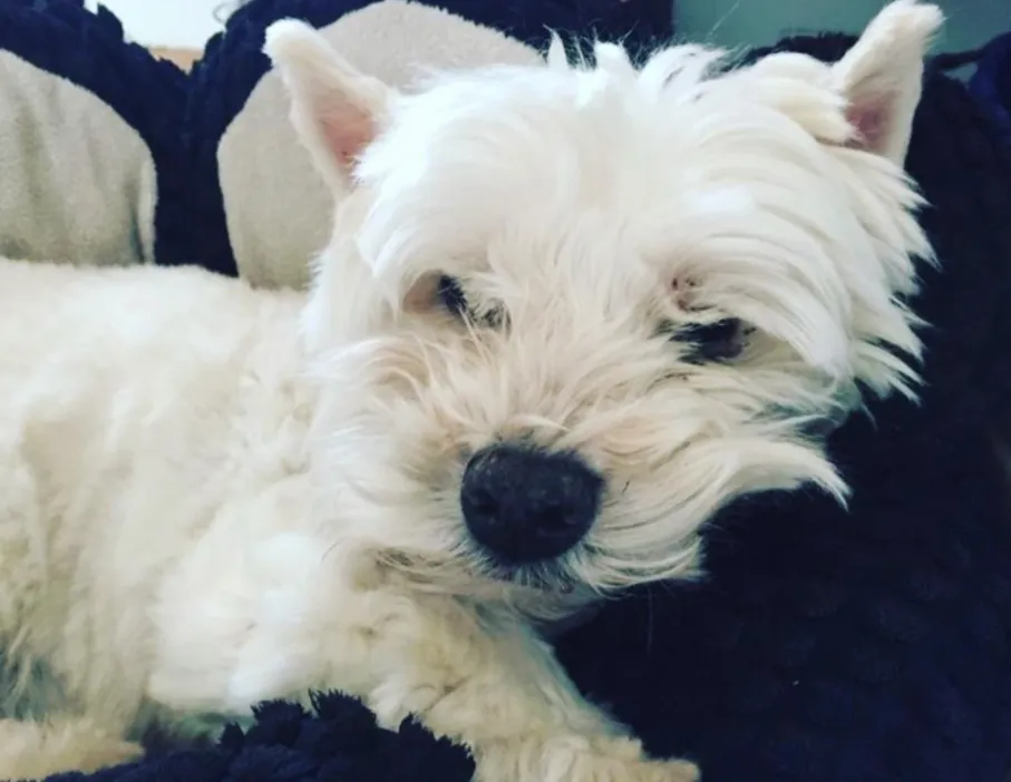 Here is Popkorn, a blind, deaf & nearly 17 yr old West Highland rescue dog.